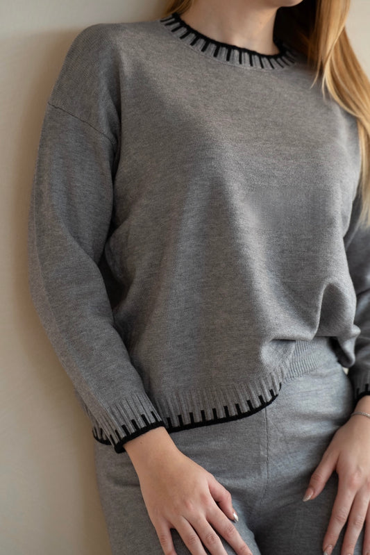 Gray Knit Lounge Set with Contrast Trim